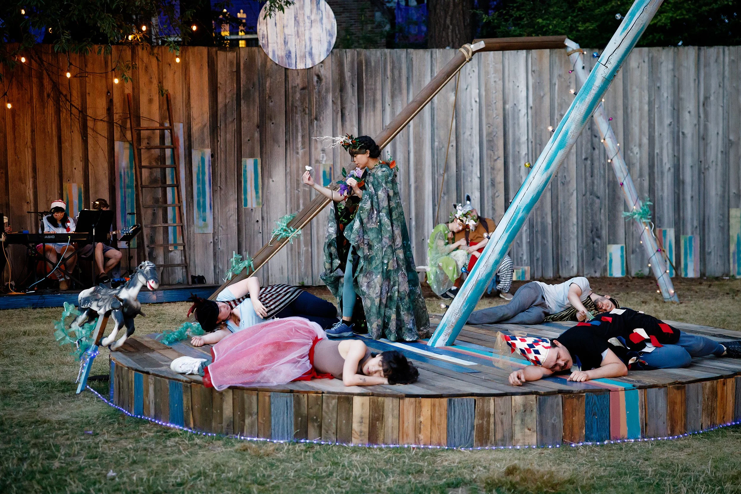 A troupe of hapless artists must put on the show of their lives, but rehearsal in the woods quickly gets out of hand when warring fairies and heartsick lovers stumble into play. In Dice: A Midsummer Night's Dream 14-show run, no two casts are the same! The design for the show brought the audeince along for the journey as we start inside the historic Glen Hughes Penthouse theater in-the-round, then move outside to the archery field when the characters leave Athens and venture into the forests beyond.